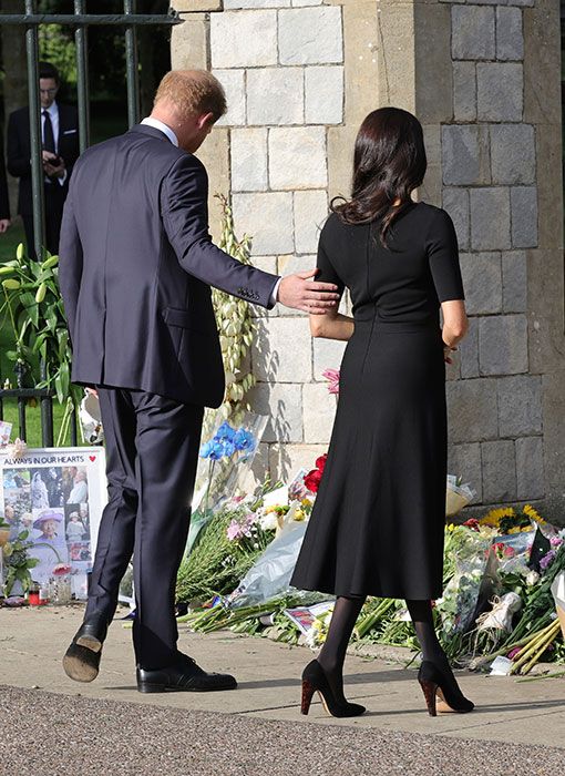 The Duke and Duchess of Sussex viewed tributes left for the Queen outside Windsor Castle