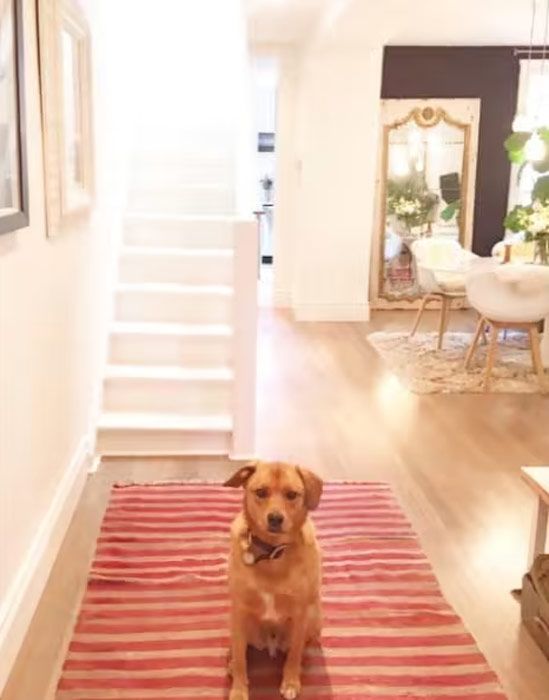 “Well hello to you too, Bogart. What a greeting. #homesweethome,” Meghan captioned this photo, which showed her pet pooch greeting her in the hallway of her home. The entrance leads straight into Meghan’s living and dining room, which had wooden flooring throughout and a red striped rug in front of a white-painted staircase.