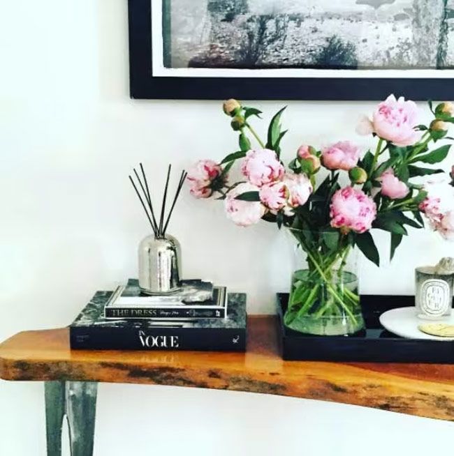 In Meghan’s room there is a wooden dresser which she has topped with a vase of flowers, Dipytique candles and two more fashion tomes; In Vogue: The Illustrated History of the World’s Most Famous Fashion Magazine, and The Dress. “Always buy yourself flowers. Especially peonies,” she told fans in the caption of this snap.