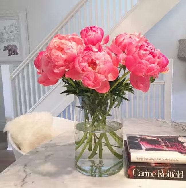 Meghan bought a classic white marble dining table, yet again adorned with a vase of peonies and two books; one about former Vogue Paris editor Carine Roitfeld, and the other about Linda McCartney. Continuing the monochrome décor, a number of white dining chairs are placed around the table, each with a soft throw draped over the back.