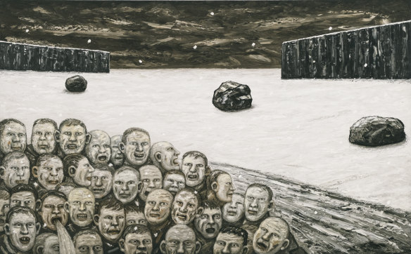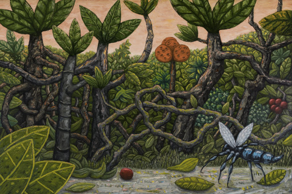 A survey at the TarraWarra Museum of Art in the Yarra Valley, curated by Anthony Fitzpatrick, takes us from one of Booth’s obdurate early abstracts of 1974 – flat vertical slabs of black paint known as doorways – through to more expressive works, on to the nightmare paintings, and then a powerful mixture of landscapes, figure studies and crowd scenes. What’s ultimately so impressive is Booth’s ability to imbue his smallest drawings or most lyrical landscapes with a sense of mystery, and often dread. Looking at a wintry landscape devoid of people, we feel they are lurking somewhere out of frame. A tropical jungle such as Painting 2022, which might have won the admiration of the Douanier Rousseau, is inhabited by a single insect that would give anyone a nasty sting. Placed in the foreground, it appears as gigantic as those bugs that roamed the Earth during the Carboniferous era, a mere 300 million years ago.